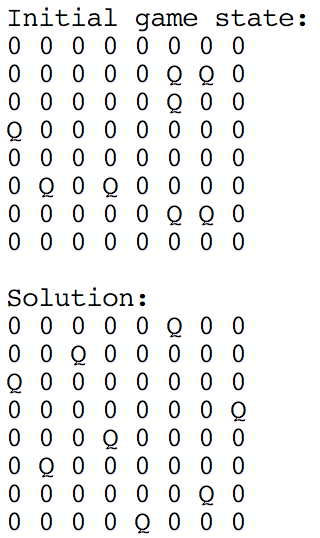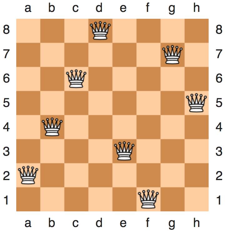 According to Sec. 3.2 of Russell and Norvig, "The goal of the 8-queens problem is to place eight queens on a chessboard such that no queens attacks any other". Recall from the proper game of chess that a queen attacks any piece in the same row, column, or diagonal. The figure below shows one of the possible solutions for this problem.